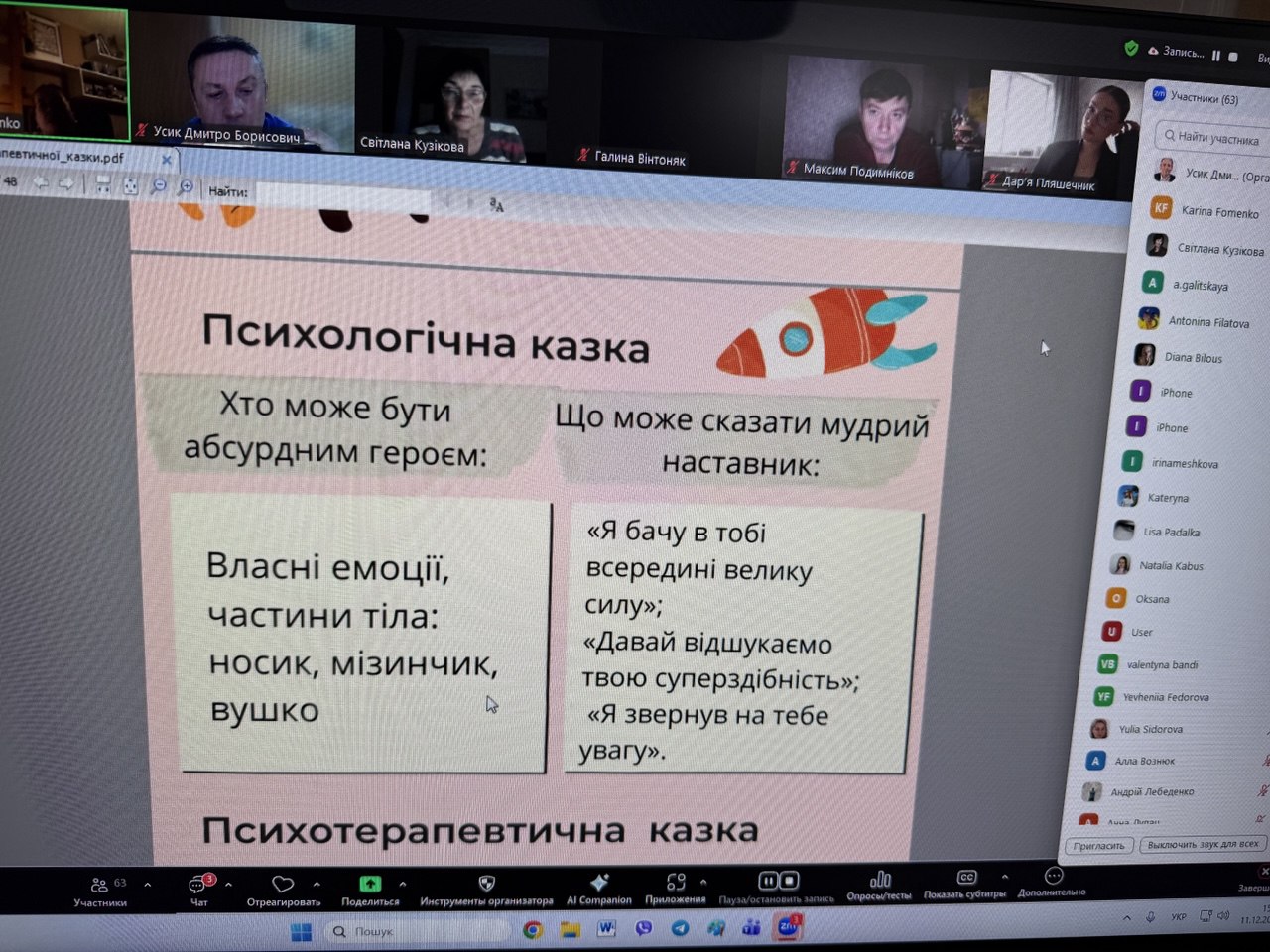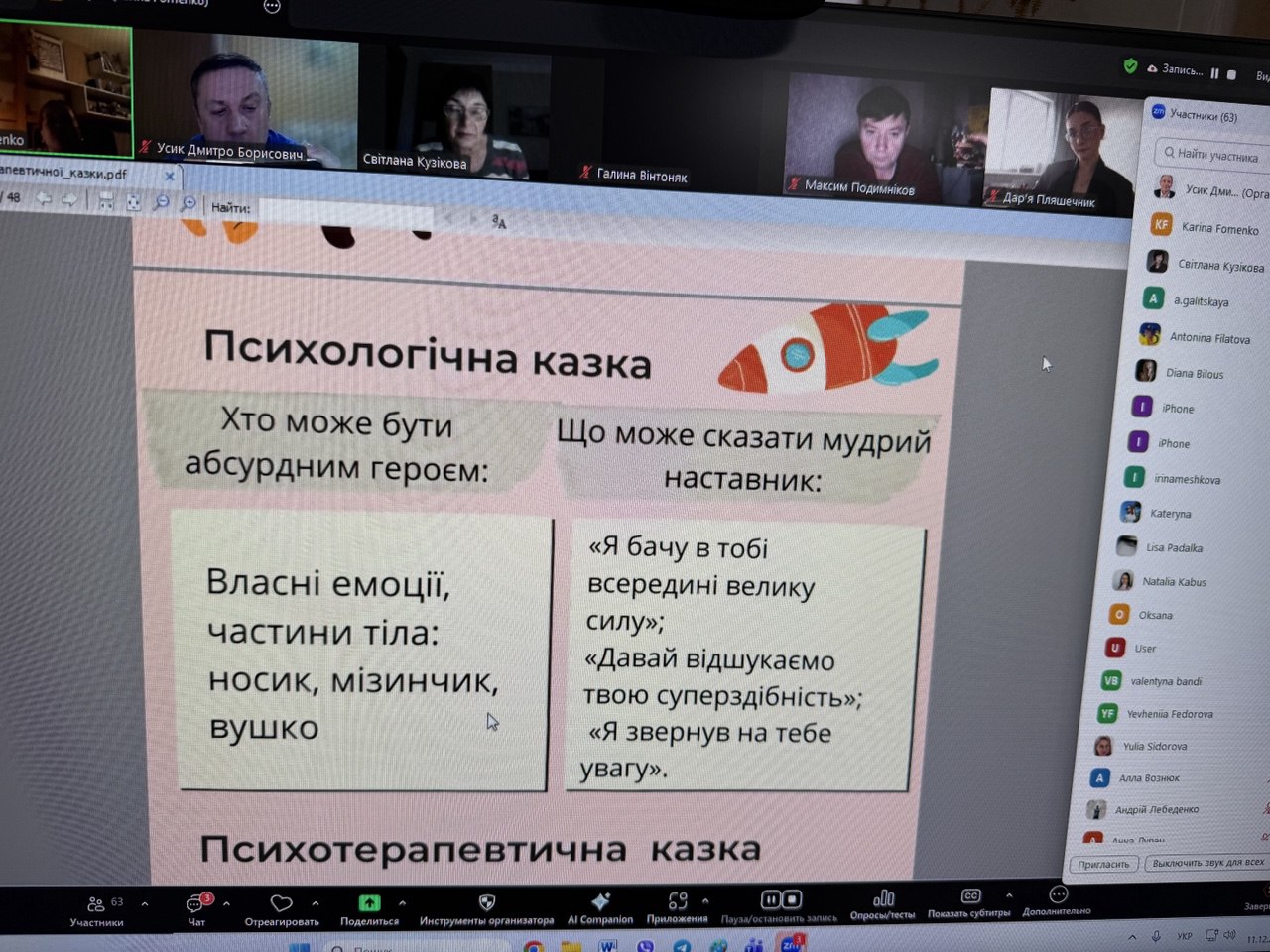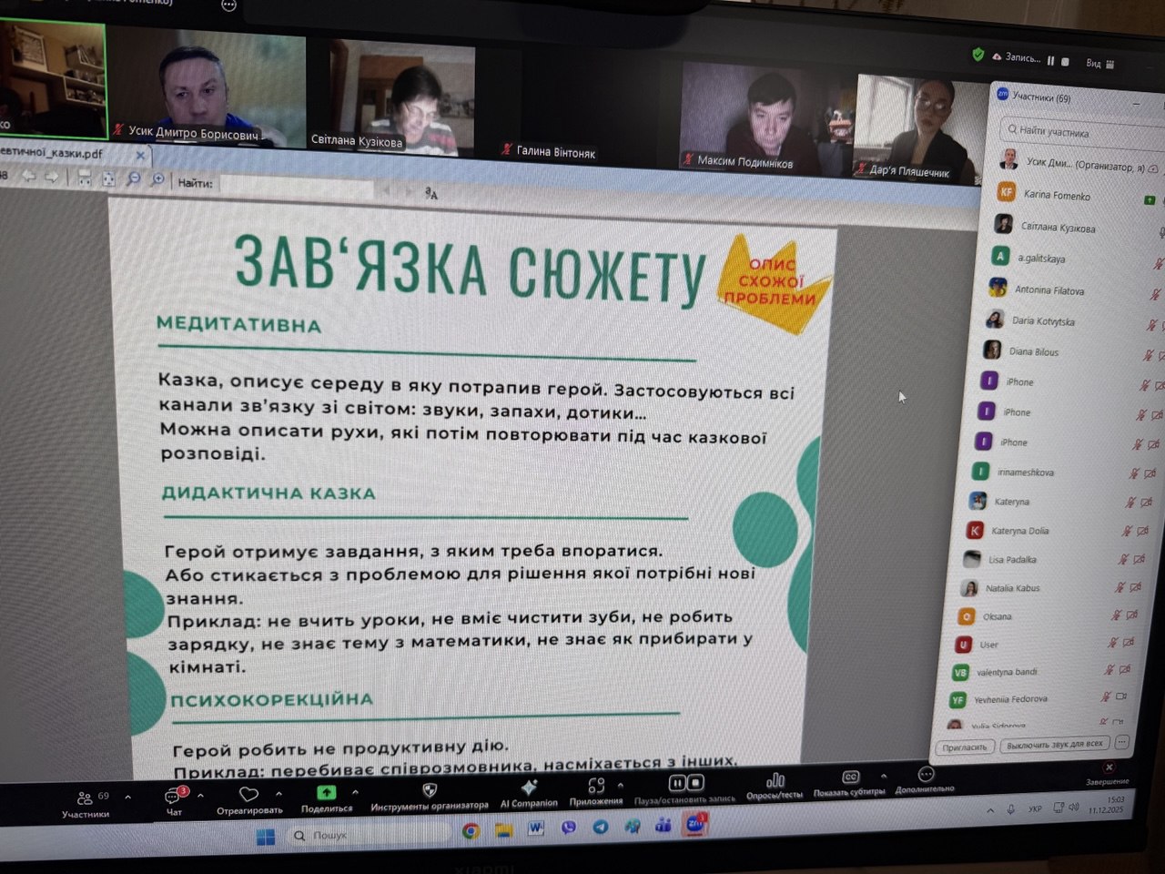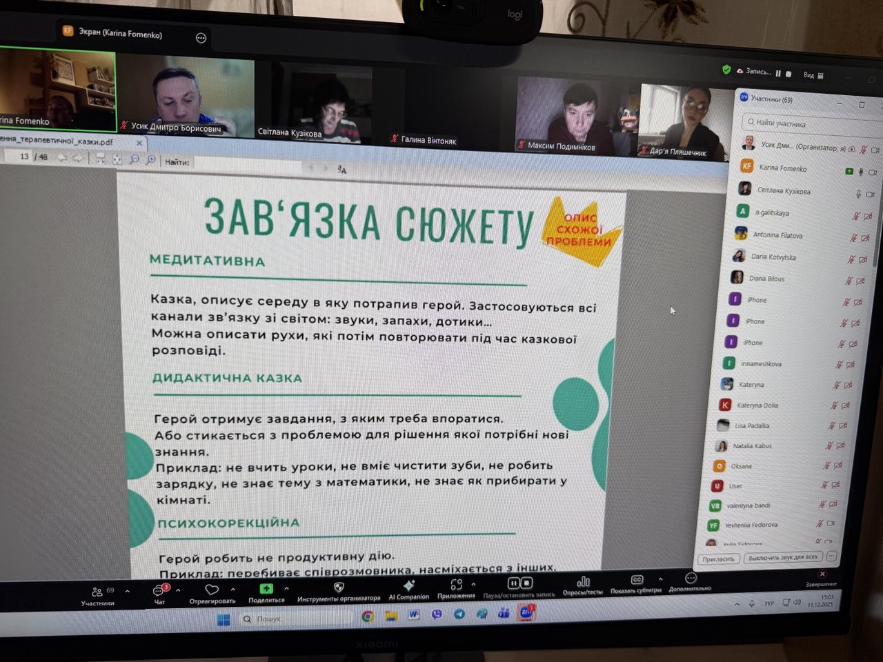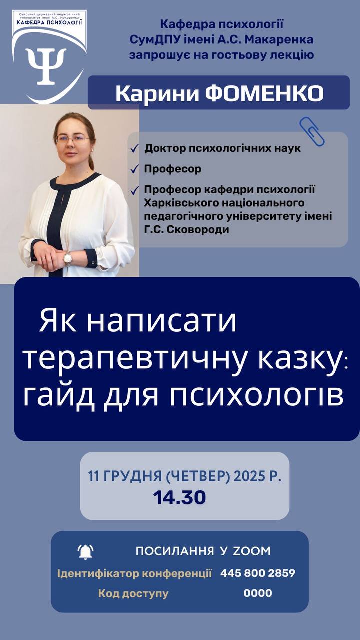 11 грудня 2025 р. на кафедрі психології була прочитана гостьова лекція доктора психологічних наук, професора, професора кафедри психології Харківського національного педагогічного університету імені Г.С. Сковороди Карини ФОМЕНКО "Як написати терапевтичну казку: гайд для психологів".